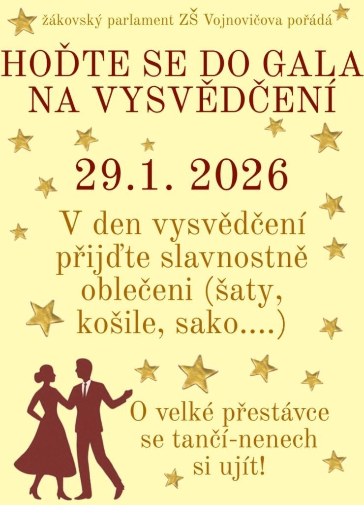 Přidejte se k celoškolní akci Hoďte se do gala na vysvědčení 29. 1. 2026. Nezapomeňte na slavnostní tanec o velké přestávce.